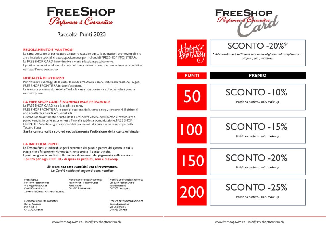 • FreeShop Perfumes & Cosmetics ti offre ancora più vantaggi. Chiedi, in occasione di un tuo acquisto presso uno dei nostri negozi, di aderire all’esclusivo programma fedeltà.