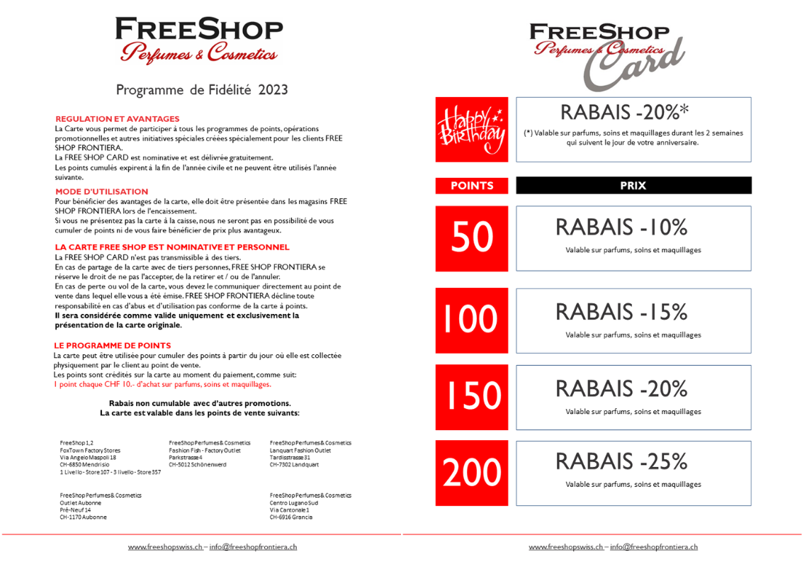 • FreeShop Perfumes & Cosmetics vous offre encore beaucoup d’avantages. Dans tous nos magasin, vous pouvez demander de rejoindre notre exclusif programme de fidélité!